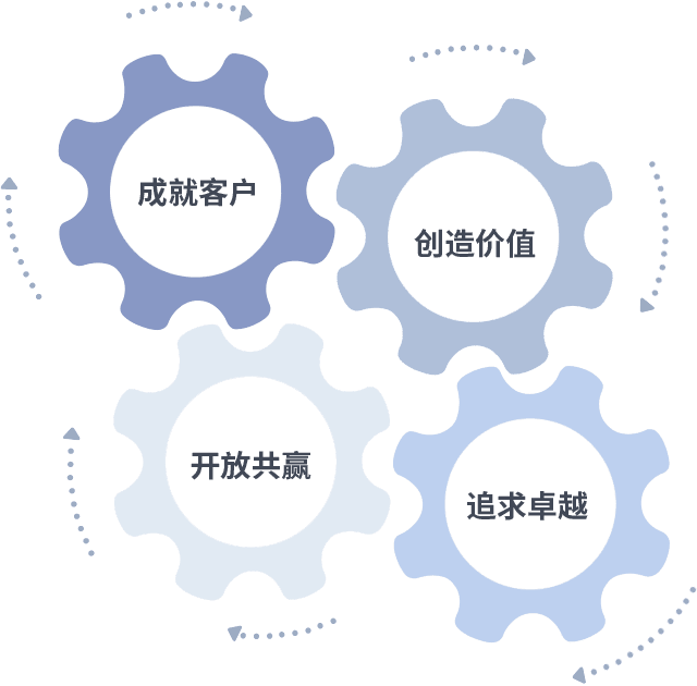 成就客户是一切决策的出发点,创造价值是衡量所有工作的标准,追求卓越是龙门国际做事做人的态度,开放共赢是龙门国际的格局也是最终的结果。价值观的齿轮环环相扣,推动着组织里的每个人不断向前。